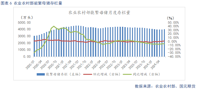 根据农业农村部数据显示,2024年6月末全国能繁母猪存栏量4038万头,同比下降6%,环比上涨1.1%。相当于正常保有量的103.5%,处于绿色区域。下半年产能去化效果逐步显现,对猪价下方形成较稳固的支撑。不过随着我国生猪行业生产效率提升以及猪肉消费需求等变化,3月1日农业农村部新修正的《生猪产能调控实施方案》发布,提出将能繁母猪正常保有量从4100万头下调至3900万头,以此来看,当前存栏基数的实际产能比预期偏大,猪价上行幅度不宜过高估计。