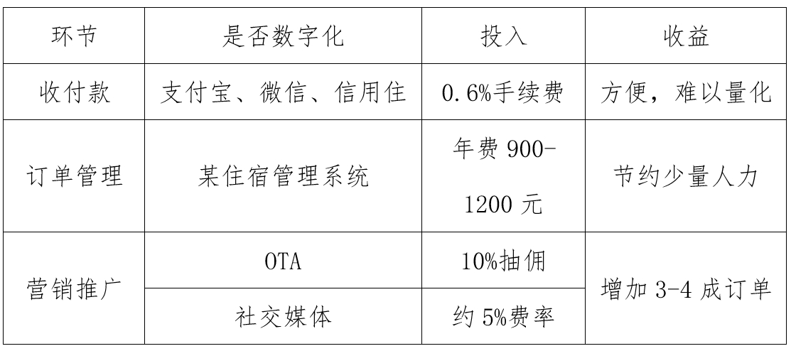 由此可见,民宿业的成败在于入住率。比如把房租出租时间从200天提高到300天,那么每年利润可以翻倍。而要让入住率提高,社交媒体营销效果是关键所在。“民宿和标准化的酒店不一样,很多都打造自己的特色。但这些细微的经营特点,在传统OTA平台上不太能充分体现,只有在社交媒体上才会被更多人注意到。而且OTA平台对民宿的抽佣也比较高。”其他环节如支付环节、住宿管理等,也都已经数字化。
