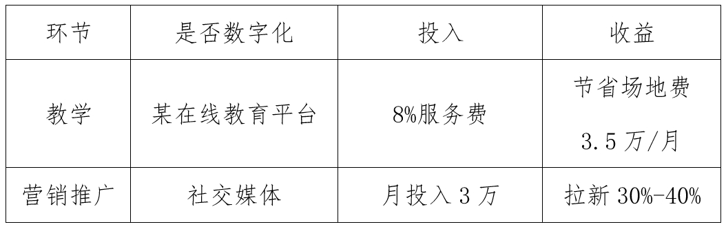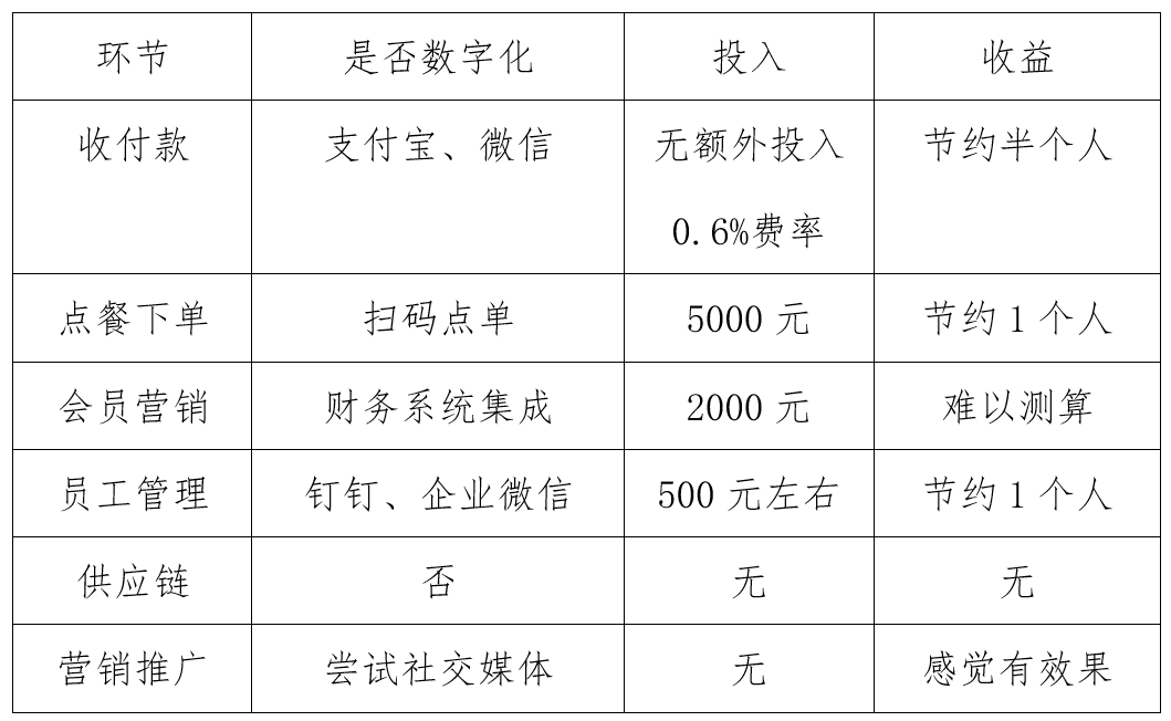 在员工管理上,使用数字化工具后,员工考勤、数据导出、移动审批、不同门店间人员调配等全部在线完成,可以优化一个人力。在供应链管理上,这家企业反映还难以数字化。这家店也在尝试通过社交媒体进行营销推广活动,没有专人负责,因此也无额外投入。从结果来看,能带来一些客流,会有人说是看到了这些推广信息来的,但效果还不好量化。